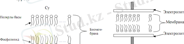 Адам ағзасының тіндері сұйықтармен қоршалған құрымдылық элементтерден - жасушылардан тұрады. Осындай элемент электр тогын жақсы өткізетін тін сұйығы мен цитоплазма жасушыларынан және оларды бөліп тұратын, токты нашар өткізетін мембранадан тұрады. Олай болса адам ағзасында белсенді кедергімен (R а ) қатар электр сыйымдылығы (С) болады екен. Тіннен тұрақты электр тогы өткенде мембрананың қарама -қарсы беттерінде таңбалары әртүрлі иондар жинақталып конднсатор типтес жүйе құрайды. Сондықтан биологиялық мембрананы электрлік конднсатор деп қарастыруға болады. (1 сурет) Конденсаторлардың астарлары ретінде липид молекулуларының полярлық басы батырылған ішкі және сыртқы электролиттердің ертіндісін қарастырады. Конденсатордың астарлары липидтің молекулаларының полярлық емес бөлігі құрайтын диэлектриктік қабатпен бөлінген. Липидтер -диэлектриктік тұрақтысы =2 тең диэлектриктер.
