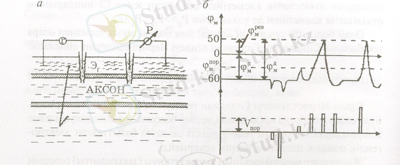 Әрекет потенциалдарды зерттеуде кальмардың аксонына кіргізілген екі микроэлектрод қолданылған (4- сурет) . Бірінші микроэлетродқа (Э 1 ) генератордан (Г) алынған мембрананың потенциалын өзгертетін тікбұрышты электр импуьсы беріледі. Мембраналық потенциал екінші (Э 2 ) микроэлектродпен өлшенеді. Қоздырғыш импульс өте тез өтетін әрекет потенциалдарын тудырады да, одан кейін тыныштық потенциалы қалпына келеді. Егер қоздырғыш сигнал теріс бағытта өзгере берсе, онда мембранада өте күшті поляризация пайда болады. Егер қоздырғыш сигнал оң болса, онда әсерлік потенциалы пайда болмайды да, оның амплитудасы сезгіштік шегінен(V ш ) төмен болады. (4, б- сурет) Әрекет потенциалы белгілі бір оң ( ә ) мәніне жеткеннен кейін мембрана потенциалы тыныштық потенциалына ( т ) қайта оралады. Осы құбылыс өшетін тербеліске ұқсас болады. Жүйке талшықтарында қаңқа бұлшық еттерінде әрекет потенциал мөлшері 1 мс ал жүрек бұлшық еттерінде 300мс уақыт болады, осы уакыт ішінде мембрана қозбайды [4] .