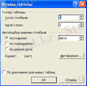 батырмасы - экранда көрінген терезеде жол, баған сандарын таңдап, жылдам кесте құру;