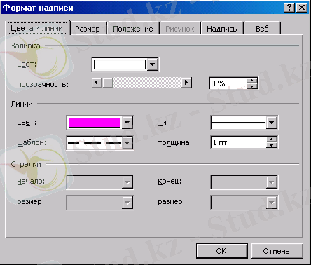 3) Жақтауды және оның iшiндегi мәтiндi форматтау үшiн, оны белгiлеп алып жанама мәзірден Жазбаның форматы… (Формат надписи…) командасын орындағанда ашылған сұхбаттық терезесiн пайдаланамыз. (17-сурет) .