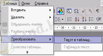 9-сурет. Кесте→Түрлендiру→Мәтінді кестеге түрлендіру командасы.
