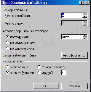 Бұл мәзірдiң ең бiр жақсы мүмкiндiктерiнiң бiрi - алдын ала терiлген мәтіндердi кестеге түрлендiру(Преобразовать в таблицу…) және керісінше. Ол үшiн терiлген мәтіннiң бағанаға бөлiнетiн аралықтарына кестелеу таңбасы орналастырылады. Ол таңбалар мәтін iшiнде қайталанбайтын тыныс белгiлерi немесе басқа таңбалар (табуляция таңбасы) болуы мүмкiн. Көбiнесе бағана аралықтары ; , : немесе табуляция (→) таңбаларының бiрiмен бөлiнiп тұруы тиiс. Сонан соң кестеге түрленетiн мәтін аумағын ерекшелеп аламыз да, Кесте→Кестеге түрлендiру командасынорындаймыз. Сол сәтте бағана саны мен олардың аралығын бөлу таңбасын көрсетудi талап ететiн сұхбаттық терезесi экранға шығады (9-сурет) . Бұл терезедегi бағаналар саны автоматты түрде анықталады, ал бөлу таңбасын (разделитель) өзiмiз енгiзумiз немесе таңдап алуымыз қажет.
