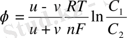 мұндағы u- катионның жылдамдағы, v- анионның жылдамдығы, R- газ тұрақтысы, T- абсолюттік температура, n- ионның валенттілігі , F- Фарадей саны, c 1 - бірінші ортадағы ионның концентрациясы, c 2 - екініш ортадағы ионның концентрациясы. Бұл өрнектен, дифффузиялық потенциалдың шамасы катион мен анионның қозғалғыштығының айрымашылығына, олардың концентрациясына тікелей байланысты екендігі көрінеді. Егер катион мен анионның жылдамдығы тең болса, немесе олардың концентрациясы бірде болса, онда диффузиялық потенциал нолге тең болады.