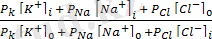 мұндағы i и 0 иондардың ішкі және сыртқы ортадағы концентрациясы, Р К , Р Na Р Cl сәйкес иондар үшін мембрананың өткізгіштік коэффиценті. Бұл өрнек Гольдман- Ходжкин - Катц теңдеуі деп аталады.