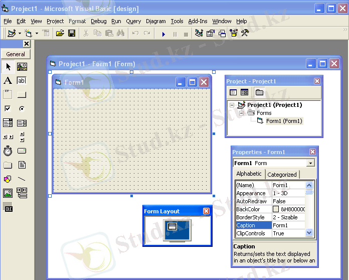 Жаңа астарлы бетіндегі Standard. Exe ерекшеленген таңбашаны таңдау арқылы біз Visual Basic жобалау ортасына стандартты тәсілмен ену мүмкіндігіне ие боламыз. Мұны жасақтаудың жинақталған ортасы деп те атаймыз. Жасақтаудың жинақталған ортасы (Integrated Development Envivonment - IDE) Microsoft’тың басқа қосымшаларынан өзімізге таныс графикалық интерфейс.