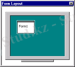 Form Layout (форма жоспарының терезесі) . Бұл терезеде қосымша орындалғанда осы форманың түрі монитор экранында қалай көрінетіндігі, яғни жобаланып жатқан форманың кішірейтілген бейнесі көрсетілетін қарапайым, бірақ айтарлықтай пайдалы сайман болып табылады.