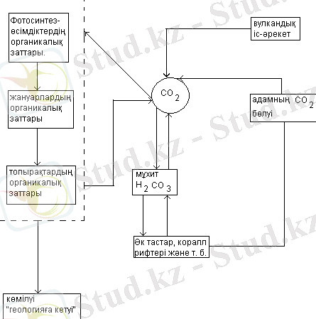 Көміртегі айналымы. Атмосферадағы С фотосинтез процесі кезінде өсімдіктердің органикалық заттарына еніп, әрі қоректену тізбегіне қатысады. Ағзалардың тыныс алу процесінде С органикалық заттардан босатылады. С негізгі массасы өлі органикалық заттардан редуценттермен (бактериялар, саңырауқұлақтар) бөлінеді. Көміртегінің шамалы (аз) бөлігі Вернадскийдің айтуынша, заттар айналымынан «геологияға кетеді» торф, көмір, мұнай, су экожүйелеріндегі карбонаттар түрінде.