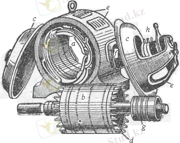 1. 2 - сурет. Фазалық роторлы асинхронды қозғалтқыштың бөлшектенген түрі: а - статор; в -ротор; с - подшипникты қорғаныс; d - желдеткіш; е- желдеткіш тесіктер; f - қорап ұстағыштары (клемма) ; g - жанасу сақинасы; h - щеткі құрылғысы.