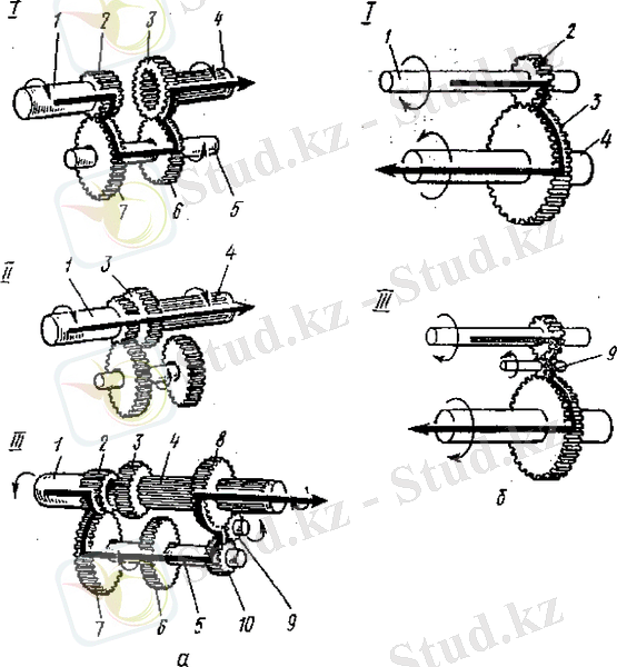 6. 1-сурет. Үш білікті (а) және екі білікті (б) беріліс қораптарының төмендеткіш (І), тікелей (ІІ) берілісті және артқы жүрісті (ІІІ) қосқандағы жұмыс сұлбасы: 1, 5-бірінші және аралық білік; 2-бірінші біліктің тісті доңғалағы; 3, 8-екінші біліктің тісті доңғалағы; 4-екінші білік; 6, 7, 10-аралық біліктің тісті доңғалағы; 9-аралық тісті доңғалақ.