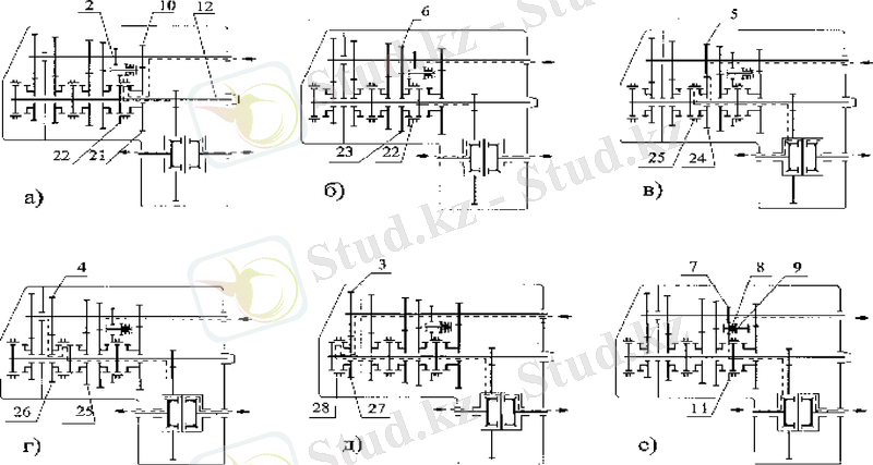6. 3-сурет 5 сатылы 2 білікті ВАЗ-2110 автомобилінің беріліс қорабының әр түрлі берілісте айналу моментін беру жүйесі.