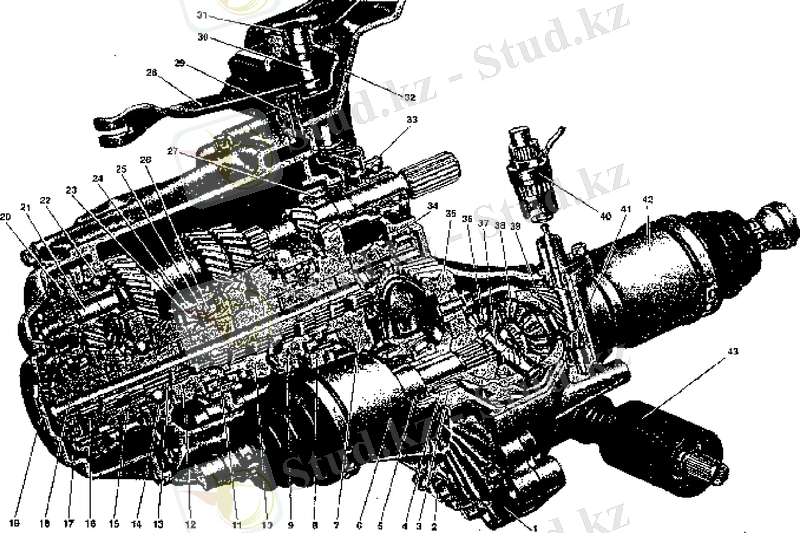 1-картер; 2-бірінші білік; 3, 27-V берілістегі жетекші және жетектегі тісті доңғалақ; 4 және 26 - ІV берілістегі жетекші және жетектегі тісті доңғалақ; 5 және 24 - ІІІ берілістегі жетекші және жетектегі тісті доңғалақ; 6 және 23 - ІІ берілістегі жетекші және жетектегі тісті доңғалақ; 7, 8 және 11 - артқы жүрістің жетекші, аралық және жетектегі тісті доңғалақ; 9 - артқы жүрістің тісті доңғалағының осі; 10 және 21 - І берілістегі жетекші және жетектегі тісті доңғалақ; 12 - екінші білік; 13 - басты берілістің жетекші тісті доңғалағы; 14 - сателлит (серік) ; 15 - сателлита осі; 16 және 20 - жетекші доңғалақтың жетегінің білігі (жарты ось) ; 17 - жарты осьті тісті доңғалақ; 18 - басты берілістің жетектегі тісті доңғалағы; 19 - дифференциал тұрқысы; 22, 25, 28 - І және ІІ, ІІІ және IV, V берілісті қосушы муфта синхронизаторлары.