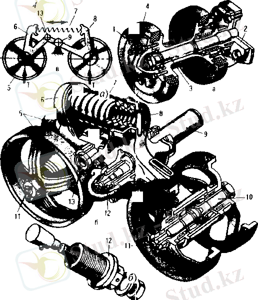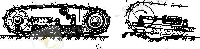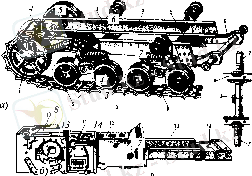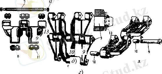 а , б - жылжытқыш типтері; в , г , д - шынжыр табан типтері; 1 - бағыттаушы дөңгелектер; 2 - шынжыр табан; 3 - ұстап тұратын аунақшалар; 4 -жетекші дөңгелек; 5 - тіректі аунақ; 6 - тақтайша; 7 - серіппе (амортизатор) ; 8 - иінтірек; 9 - саусақша; 10 - металл төлке; 11 - резиналы металл төлке (шарнир) ; 12 - бұранда; 13 - тежегіш сақина.