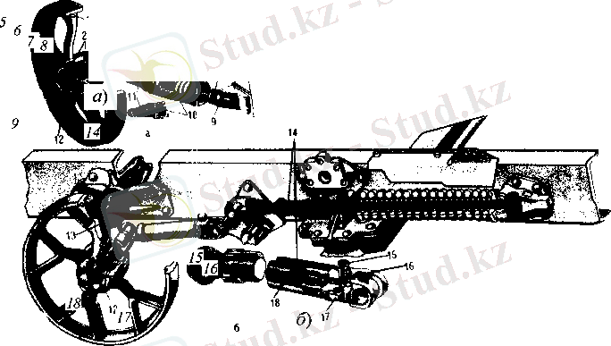 а - механикалық; б - гидравликалық; 1 - бағыттаушы дөңгелек; 2 - мойынтірек; 3 , 13 - иінді ос; 4 - серіппелер; 5 - артқы тірек; 6 , 12 - бұрандалар; 7 - реттегіш бұранда; 8 - кронштейн; 9 - сфералық тірек; 10 - бұрама; 11 - үштармақты кронштейн; 14 - гидроцилиндр; 15 - клапан корпусы; 16 - пластиналы клапан; 17 - майлағыш; 18 -поршень.