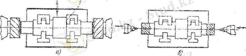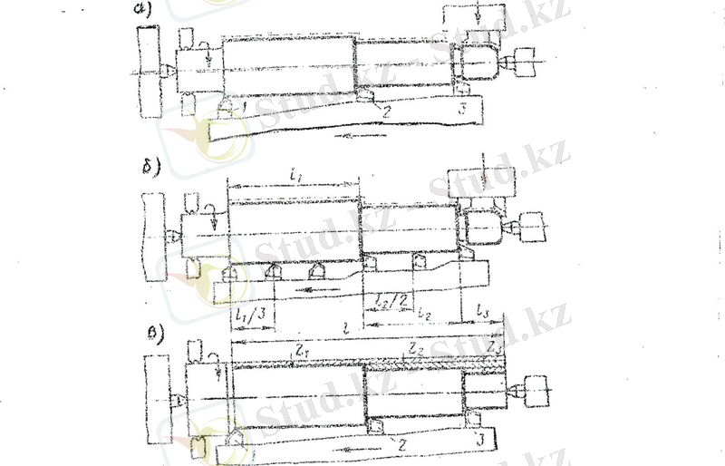 Егер технологиялық жүйенi текпiшектi бiлiктiң ең қысқа ұзындығымен Еl 3 (5, б-сурет) жобаласақ, онда бiлiктiң басқа ұзынырақ текпiшектерiн бiрнеше кескiштермен өңдеу қажет. Мұнда аспаптар саны текпiшектiң ұзындық қатынастарына байланысты Еl 1 /l 3 және бұл вариант бiрiншiге қарағанда өнiмдiрек, бiрақта өңделiнген беттерде кертiктi ақаулар қалып отырады.