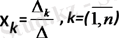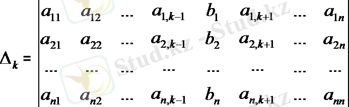 Берілген жүйенің бас анықтауышының бірінші тік жолының элементтері x1 белгісіздің коэффициенттері, ал екінші тік жолдың элементтері x2 белгісіздің коэффициенттері т. с. с. Осы анықтауыштың кез келген тік жолының, мысалы к-тік жолының элементтерін (xк белгісізінің коэффициенттерін) (1) жүйенің сәйкес бос мүшелерімен орын алмастырғанда алынған анықтауышты