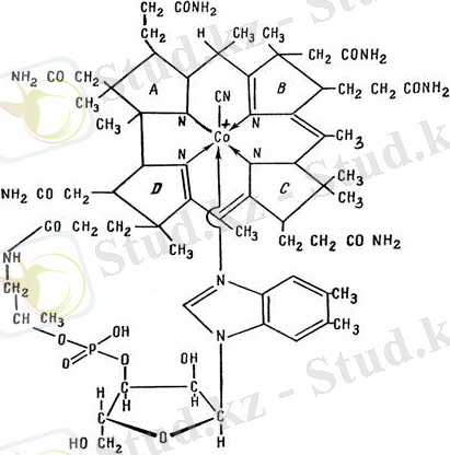 витаминінде кобальт циан тобымен және координациялық байланыспен коориндік циклдік жүйесімен байланысқан. Бұл жүйе гемопротеиндердің және гемнің порфирин тобына ұқсас және рибоза мен фосфор қышқылының қалдығы бар 5, 6 - азотымен байланысқан: