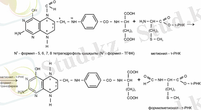 Тетрагидрофоль қышқылына бір көміртегі бар фрагменттер 5-ші және 10-шы азот атомдарымен коваленттік байланыспен байланысады (немесе екі атоммен бірдей) . Бұған мысал ретінде рибосомада белок биосинтезі басталатын формилметионил - т - РНК биосинтезінде формил тобын тасымалдауын келтіруге болады: