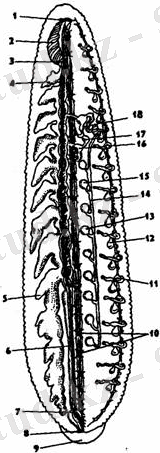 20 -сурет. Медициналық сүліктің анатомиясы. 1-церебральді ганглии, 2-жұтқыншақ, 3-өңеш, 4-асқазанның алдыңғы қалтасы, 5-асқазаның артқы қалтасы, 6-ортаңғы ішек, 7-артқы ішек, 8-анус, 9-артқы сорғыш, 10-ганглии, 11-метанефридий, 12-қуық, 13, 15- аталық без, 14-тұқым жолы, 16-қынап, 17-аналық без, 18-пенис.