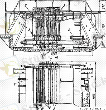 а - бүйіржақ жағынан түрі, б -жоспар; 1 - табаны, 2- жұпты ажырату, 3 - тіреуіш роликті кронштейндер, 4 - қоршауыш басқыш, 5 - гидравликалық домкраттар, 6 - поддоны, 7 - насос жетегі, 8 - ажыратқыш қабырғалар, 9-қалыптайтын панельдер