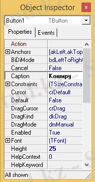 Button1- ден Button9-ға дейінгі компонеттердің атын өзгерту үшін Object Inspector-де Caption-ға бізге керек жазуды жаза аламыз немесе Button1 компонентіне тышқанмен 2 рет шерту арқылы бағдарлама кодын енгізе отырып, атын өзгерте аламыз.