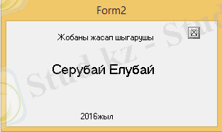 MainMenu1 компонентінің Көмек батырмасын басқан кезде жобаны жасап шығарушы шығады. Мен оны жаңадан Form2 ашып, Label1, label2, label3 компонетін қолдынып, өзімнің аты-жөнімді жаздым. Сaption қасиетінде көпнукте ( . . . ) шерту арқылы немесе label1 компонентіне екі рет шерту арқылы жазуға болады. Бұл формадан шығу үшін Button1 компонентін қолдандым және оны астындағы суреттен көруге мүмкіндіктеріңіз бар.