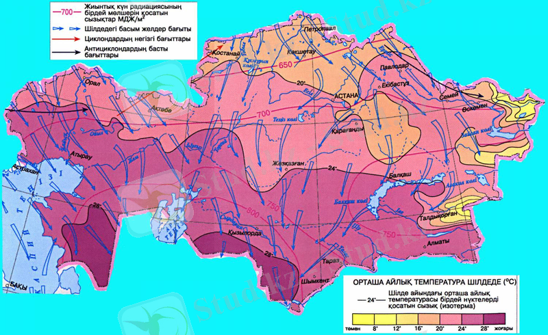 Қазақстанда жылудың булануға жұмсалатын жылдық шығынының мөлшері солтүстіктен оңтүстікке қарай 630-дан 420 МДж/м 2 -ге кемиді. Шөлді өңірдің қуаңшылық маусымында жылудың көп мөлшері турбулентті жылу алмасуға кетеді. Тек топырақтың көктемгі ылғалға қаныққан кезінде, сол сияқты көгалды жерлерде буландыруға кететін жылу мөлшері ауаны турбулентті жылу алмасу жолымен қыздыратын жылу шығынынан артық болады. Жазғы шұраттық құбылыс, яғни булану есебінен күндізгі ауа температурасының қала төңірегіне қарағанда төменірек болуы Алматыда жақсы байқалады. Радиация мен жылу балансының өзгерісі ауа температурасын өзгертеді. Қаңтар айының орташа температурасы Қазақстанның солтүстік және шығыс аудандарындағы - 18°С-тан оңтүстік аудандарында 3°С-қа дейін көтеріледі. Шілденің орташа температурасы бұл аудандарда тиісінше 19°С-тан 28 -30°С-қа дейін. Қазақстанның солтүстік-шығысында климаттың континенттігі тым жоғары, бұл өңірде қаңтар мен шілденің орташа температурасының айырмашылығы 41°С-қа жетеді. Оңтүстік аудандарда 10 ай бойы орташа тәуліктік температура 0°С-тан жоғарырақ болады. Республиканың солтүстігінде қыс ұзақ, қарлы әрі суық, аяз кей уақыттарда -45°С-тан -50°С-қа жетеді. Жазы қоңыржай жылы, қысқа, кейде ауа температурасы 35°С-тан 45°С-қа дейін қызуы мүмкін. Көктемнің соңғы үсігі шілдеде, ал күздің ерте үсігі тамыздың аяғында түсуі мүмкін.