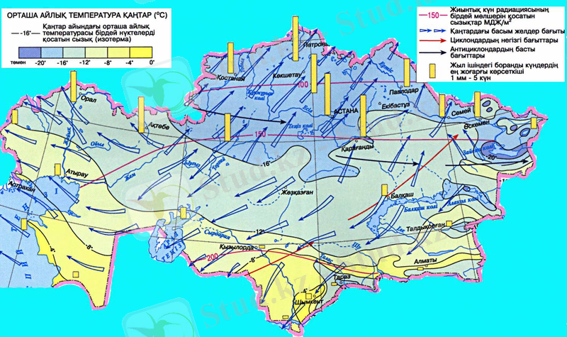 Қазақстандағы ең суық ай - қаңтар . Қазақстанның ең суық жері Атбасар өңірі, ол жерде бір жылдары -57°C температура тіркелген. Қазақстандағы ең жылы ай - шілде . Ең жоғарғы температура солтүстікте 41°C, оңтүстікте 47° C аспайды. Өсіп-өну кезеңі дегеніміз өсімдіктің көктеп, гүлдеп, жеміс беруіне кететін уақыт.