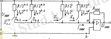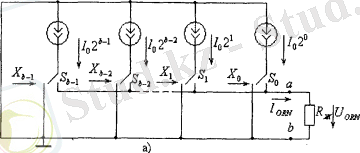 1 0 2' тоқ қуатының эталонын алудың ең оңай жол - кедергісі кipic код коэффициенті салмағына прапорционал бірнеше резисторларды U rej - қуат көзіне қосу (5. сурет) . Мұндай резисторлар өлшеушілер деп аталады. Ceбебі ОК үшін U a =U b =0 болғандықтан резисторлардағы тоқ ондағы кедергілерге кepi прапорционалды болады I i = U REF 2 i /R = 1 0 2' бұл жерде 1 0 = U REF /R.