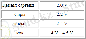 Жарық диодтары. LED (жарық Диоды) әртүрлі түсте қолданылады. Қызыл, жасыл және сары түстер жиі қолданылады. Әсіресе олар автомобилдерде жиі қолданылады (бақылау шамдарында және фарларында) . Қазіргі кезде көк LED жиі қолданыла бастады. Көзге көрінетін LEDтен басқада адамның көзіне көрінбейтін инфрақызыл диапазонында жұмыс істейтін LED болады.