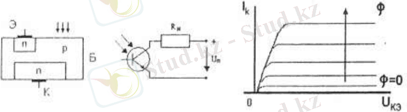 Жарық ағымы базада заряд жұптарын өндiре отырып эмиттерлi р- n өтпесінің жазықтығына перпендикулярлы түрде әсер етедi. База үшiн негiзгi емес болып саналатын зарядтар K Ι, тоғын күшейте отырып коллекторлар өткізгіш аймаққа тартылады. Алайда, бұл тоқ K Ι коллекторлы тоғының тек бір бөлігi ғана, өйткенi базадан негiзгi емес тасымалдағыштардың кетуi онда негізгi тасымалдағыштардың компенсацияланған көлемдi зарядын қалыптастырады. Бұл заряд эмиттерлi ауысудың потенциалды тосқауылын төмендетедi. Нәтижесiнде эмиттер көмегiмен база аймағына инжекцияланатын заряд тасымалдағыштарының саны көбейеді, K Ι коллектор тоғының өсуiне себеп болады. Сонымен, фототранзисторды фототоқ бойынша күшейту орындалады, бұл оның фотодиодқа қарағанда сезiмталдығын жоғары екенiн көрсетедi.