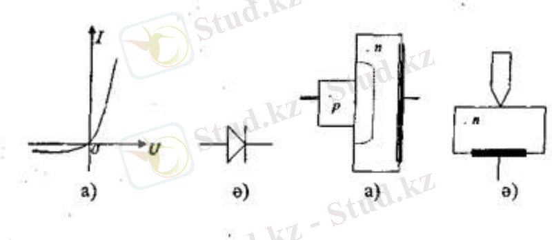 Жартылай өткізгішті диодтар. Бір р-п ӛтпесіне негізделген, электр тоғын бір бағытта өткізетін, электрондық аспап, жартылай өткізгіш диод деп аталады. Жартылай өткізгіш диод айнымалы тоқты түзетуде, модуляцияланған радиосигналдарды детектрлеуде қолданылады. Жартылай өткізгіш диодтың вольт-амперлік сипаттамасы 4, а-суретте көрсетілген. Мұнда тура кернеу кернеудің оң мәндеріне, ал кері кернеу теріс мәндеріне сәйкес келеді. 4ә-суретте жартылай ӛтікізгіш диодтың шартты белгісі келтірілген.