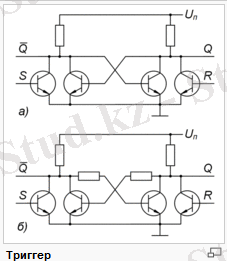 Триггер деп электрондық есептеуіш машиналарында, автоматика мен телемеханиада әртүрлі операциялар орындауға арналған, яғни алынған информациясақтауға /сақтағыш құрылғы/, уақыт датчигі схемасында және цифрлы санауыштарда импульстарды санауға, цифрлы жиілікті бөлгіштерде қолданылатын электрондық ауыстырып қосылғыш құрылғыны немесе аударылып түскіш құрылғыны айтады.