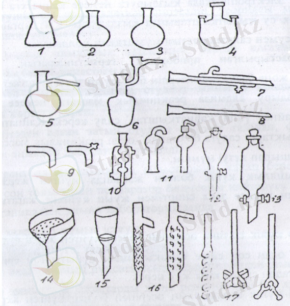 Шыны ыдыстардың мынадай турлері кобінен пайдаланылады. (1 - сурет) Органикалық химияда эксперимент кезінде жазық және дөңгелек табанды колбалар колданылады. Мысалы айдау кезінде кабылдағыш ретінде жазык табанды (1, 2) колбалар колданылады. Бұл колбалар және ертнділерді дайындау үшін, сақтау үшін қолданылады. Жазық табанды колбаларды ваакумда жұмыс жүргізгенде қолдануға болмайды. Жоғарғы температурада және ваакумда жұмыс жасағанда дөңгелек табанды колбаларды (3, 4) қолданады. Дөңгелек табанды колбалар әртурлі болады: бір-, екі-, үш-, төрт- мойынды. Үш және төрт мойынды колбалар кьздыру мен араластыру қатар жүргенде, реакция кезінде температура өлшеу немесе реагенттерді біртіндеп қосу үшін қолданылады. Сұйықтарды атмосфералық қысымда айдау уүшін дөңгелек түпті Вюрца колбасын (5) ал вакуумда айдау үшін Кляйзен колбасын (6) қолдануға болады. Томенгі температурада (150"С) қайнайтын сұйыктарды айдау үшін Либих мұздатқышы (7), жоғарғы температурада қайнайтын суйықтар үшін ауа мұздаткышы (8) қолданылады. Мұздатқыш пен қабылдағыш колбаны косу үшін аллонж (9) қолданылады. Тез ұшатын сұйықтарды қыздырған кезде реакция жүретін колбаларға қайтарымды мұздатқыштар жалғанады. Қайтарымды мұздатқыштар ретінде Либих немесе ауа мұздатқыштарын пайдалануға болады. Тек оларды колбаға вертикал бекіту керек. Интенсивті суыту керек болганда арнаулы шарикті (10) мұздатқыштар колданылады. Егерде колбаны ылғал немесе комірқышқылдарынан қорғау керек болса хлоркальций (II) түтігін қолданады. Хлоркальций түтігін құрал-жабдықтарға имек шыны түтіктер аркылы косу кажет. Реакциялық қоспаларға синтез кезінде сұйық заттар құю үшін ұзын түтікті, краны бар әртүрлі тамызу воронкаларын (12) пайдаланған жөн. Арапаспайтын сұйықтарды бөлуге және ерітінділерді экстракциялау үшін калың шыныдан істелген бөлгіш воронкалар (13), ал пайда болған кристалдарды сүзу үшін Бюхнер (14) воронкаларын қолдануға болады. Күкіртқышқылды сұйықтарды сүзуге Шотта (15) фильтрін қолданады. Айдау кезінде қайнау температурасы бір-біріне жақын екі сұйықты толық бөлу мақсатында дефлегматорлар (16) колданылады.