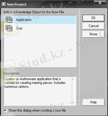 Authorware 6-ны әр кез қосқан кезде, сонымен қатар жаңа файл ашқан кезде экранда диалогтік терезе New Project (жоба ашу) ашылады. Ол екі түрі алдын ала дайындалған обьектке кіруге рұқсат береді ( сурет 2) :