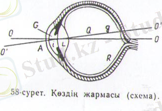 Адамның көзі (587 -сурет) мүйіз қабықша (А) ; хрусталик (L) ; сулы ылғал (G) және шыны тәрізді (Q) денеден тұрады. Бұлардың жарық сындыру көрсеткіштері әр түрлі: мүйіз қабықшанікі 1, 367 - ге; хрусталикті 1, 39 - ға, сулы ылғал мен шыны тәрізді дененің әрқайсынікі 1, 33 - ке тең.
