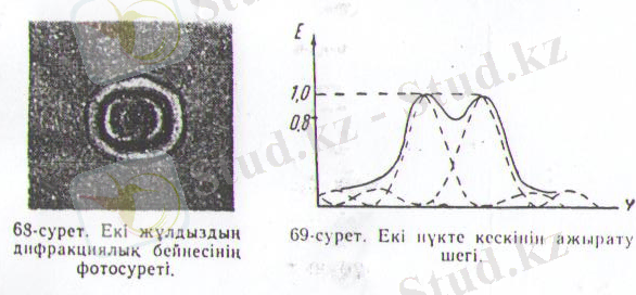 бұл жағдайда дифракциялық кескіндер бойынша жарықталынудың таралуын көрсететін қисықтардың (69 сурет) қиылысу нүктесінің орндинатасы олардың максимумдарына сай ординаталарының 0, 4 үлесінен кем болады, қорықты қисықтың минимумына сай ординатасы оның максимумына сай ординатасының 75% - на тең болады. Сонда минимумға келетін салыстырма лйпаң 25% - ке жетеді де көзге екі максимум аралығында қара- қоңыр жолақ бар сияқты болып көрінеді.