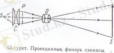 2. Прпорциалық фонарь. Мөлдір суреттердің (диапозитивтердің) кескіндерін үлкейтіа көрсетуге арналған оптикалық прибор проекциялық фонарь (65-сурет) деп аталады. Оның негізгі бөлімдері - жазық - дөңес линзалардан құралған С конденсаторы және дөңес линзадан жасалған О объективі. Конденсор көрсетілген Р диапозитивтің жарықталуын күшйетеді, объектив оның Е экранға шын кері және ұлғайтылған кескінін түсіреді. Экрандағы кескіннің жарықталынуын фонарь объективінің салыстырма