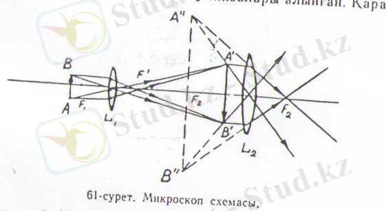 2. Микроскоп. Жақындағы ұсақ өте үлкейтіп көру үшін түрліше микроскоптар қолданылады. Әрбір микроскоптың оптикалық системасы объектив және окуляр делінетін екі бөліктен құралады. Қарапайым микроскоптарды бұл бөліктері жеке линзалардан жасалады, ал осы күнгі микроскоптардың объективтері емн окуляры центрленген күрделі оптикалық системалар болып келеді. 61 - суретте нәрсені микроскоппен қарағандағы жарық сәулелері жолы көрсетілген, мұнда объектив және окуляр ретінде L 1 және L 2 линзаларына алынған. Қаралатын кішкентай АВ нәрсе қысқа фокусты L 1 объективтің алдына, алдыңғы фокустан сәл алыстау қойылады.
