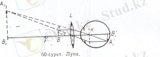 1. Лупа нәрсені үлкейтіп көру үшін қолданылатын жинағыш линз лупа деп аталады. Бақыланатын нәрсе линза мен оның фокус жазықтығы аралығына нәрсені лупамен қарағандағы жарық сәуллер жолдары көрсетілген. Мұнда А нүктесінен шыққан сәулелер әуелі лупадан өткенде сынады, одан соң көзге ніп, оның сындырғыш орталарынан өтіп, тағы да сынып, ақыры тор қабықшаның А 1 нүктесіне келіп толығысады. А 1 нүктесі А нүктесінің шын ескіні. Егер L лупа жоқ болып, көз тиісті қашықтықтағы үлкейгн А 1 В 1 нәрсені тікелей көрген болса, яғни А нүктесі А нүктесі орнында тұрса, бұл жағдайда да оның кескінгі сол А 1 нүктесінде болған болар еді. Сөйтіп лупадан өтіп сынған сәуллер көзге түскенде А 1 В 1 жорымал кескін нақты нәрседей болып түседі.