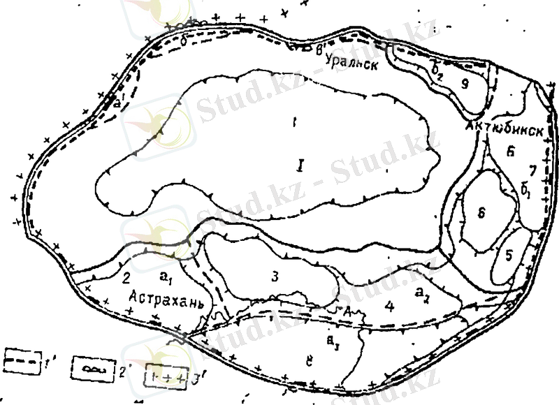 1 - ернеулі кертпеш, 2 - кедертасты кешендер, 3 - кунгур жікқабатында тұздардың таралу контуры. Аса ірі тектоникалық элемент: - Прикаспий синеклизасы, ірі тектоникалық элементтер: 1 - Орталық Каспий депрессиясы, 2 - Астрахан дөңесі, 3 - Солтүстік-Каспийлік көтерілім, 4 - Биікжал көтерілімі, 5 - Жарқамыс көтерілімі, 6 -Қызылжар көтершімі, 7 - Еңбек көтерілімі_ 8 - Оңтүстік Ембі ойысы, 9 - Қарашығанақ-Қобыланды мегабелі. Мұнайгаз-геологиялық аудандастыру: А - Оңтүстік-Каспий маңы МГО (а, - Астрахан МГА, а 2 - Орал-Ембі МА, а 3 - Пример АМ), Б - Шығыс Каспий маңы МГО (б, - Солтүстік Ембі МГА, б 2 - Елек ГА) ; а 1 - Солдат-Степков СГА, б 1 - Карпен СМГА, в 1 - Теплов СГА