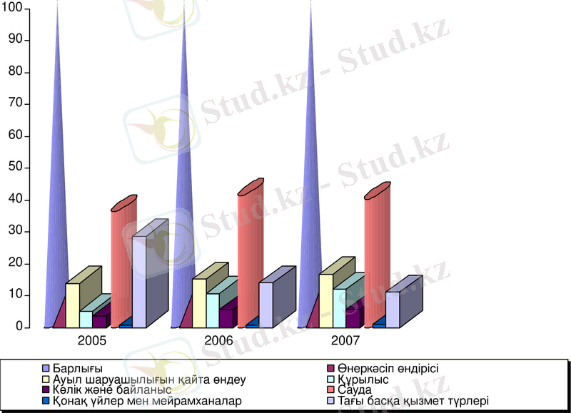 Суретте келтірілгендей, 2007 жылы 2006 жылдың көрсеткішімен салыстырғанда өнеркәсіп өндірісіндегі кәсіпкер тұлғалардың санының 1, 4 есеге артқаны анықталып, 2005-2007ж. ж. басқа кәсіп түрлеріне қарағанда саудадағы кәсіпкерлердің үлес салмағының басымдығы байқалды. Бұл көрсеткіш 2007 жылы 40, 36 пайызды құрады.