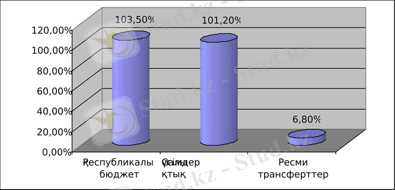 Суреттен көріп отырғанымыздай, республикалық бюджеттің орындалуы 103, 5 пайызды құрап отыр, алқаржылық түсімдер 101, 2 пайызға орындалған. Демек, республикалық бюджеттің орындалуын қаржылық түсімдер құрап отыр. Мемлекеттің есебінен түсімдер көлеміндегі ресми трансферттер (субвенция) пайыздық үлесі 6, 8% құрайды.