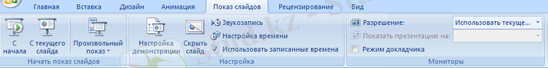 - Показ слайдов. Презентациядағы слайдттарды және обьектілерді басқаруға арналған командалардан (анимацияны баптау, қосалқы анимацияны қолдану, слайдты ауыстыру эффектілері, презентацияларды баптау және т. б. ) құралған.