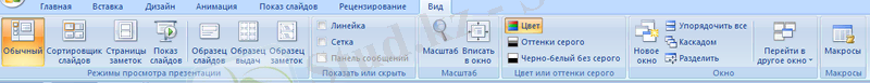 - Вид. Презентация түрін таңдау және саймандар панелін басқару командалары, слайдттар нұсқаларын көруге және бейнелер масштабын өзгертуге арналған командалары кіреді.