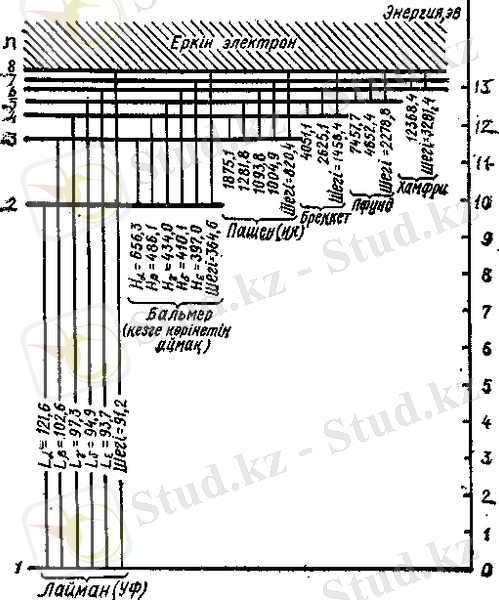 5-сурет. Сутегі атомындағы әрекетке ену деңгейінің және олардың арасындағы Лайман, Бальмер және т. б. серияларының линияларын беретін ауысу схемасы