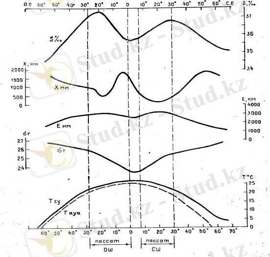 Әлемдік мұхиттағы гидрометеорологиялық сипаттамалардың ендік бойымен өзгеруі: 5% 0 - тұздылығы; X - жауың-шашын; Е-булану; Т -судың температурасы; Т -ауаның температурасы.