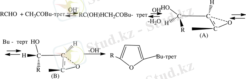 α, β - жағдайдағы альдегидтер немесе кетондар карбонилді топтарға ие β-көміртегі атомындағы орынбасуды транстық орналасуда қамтамасыз етеді. Стереоселективтілік конформациядағы (В) енолят дегидратация жағдайында анықтайды, енолят-анионы және β-орынбасуы мен шектелген жағдайда стериялық әрекеттеседі [17] . Фурфуролдың конденсациялық реакциясы әртүрлі фурилді қосылысы бар қосылыстарды синтездеуге толық мүмкіндігі арқылы болады. Фурфуролдың химиялық барлық гомологтары және ядро туындысында орналасуы фуран-3-альдегидіне байланысты.
