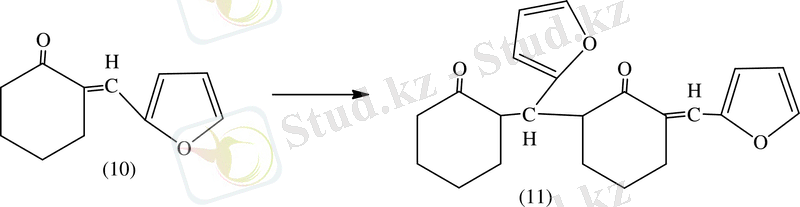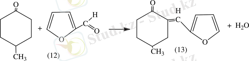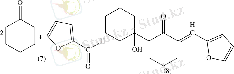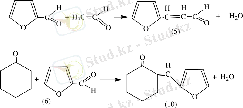 Фуронның конденсация әсерінен белсенді метил тобы бар 2, 5-диальдегидті қосылыстары жайлы Г. Ф. Терещенко, Г. Н. Колдобский, Л. И. Батилом [18] өз еңбектерінде айтқан. Альдегитер мен кетондар кротондық типте конденсация процесі жүреді, мысалы, ацетоальдегид (5) және циклогексан (6) .