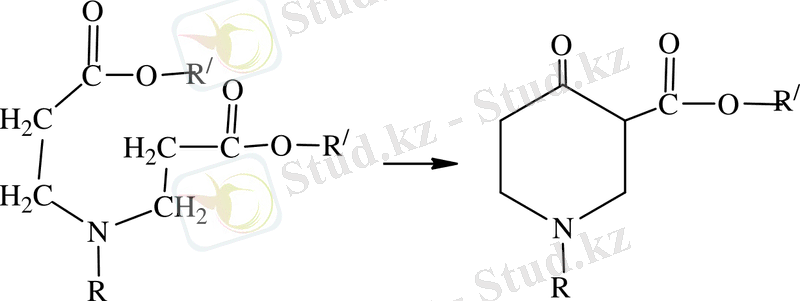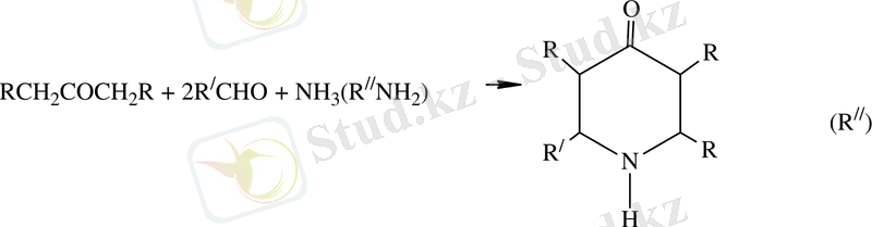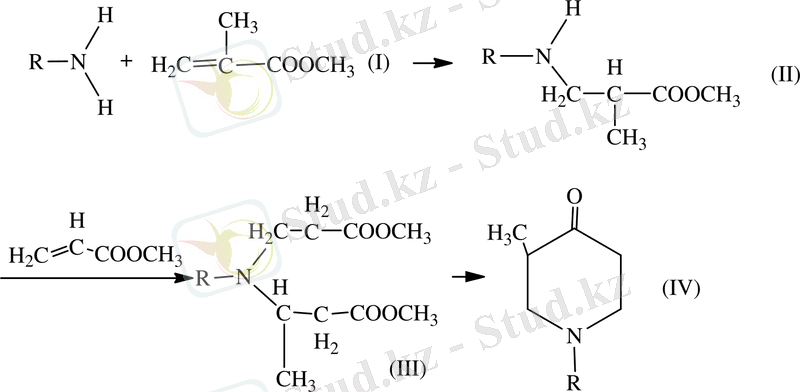 Берілген жұмыс біріншілік алифатты аминдерді акрилонитрилмен және метилакрилпен катализатор қатысында сатылап реакцияны жүргізуге болады[8, 9] . Бұл екі реакцияның өнімі β-карбометоксипропил болатын, β-карбометоксиэтил (алкил) алкагил (аминдер (ІІІ) бұлар циклдену жолымен 1-алкил-3-метил-пиперидон-4 (ІV) [10, 11] айналады, олардың негізінде жоғары белсенді аналгетиктер мен анестетиктер) айналып алынады [12, 13] .