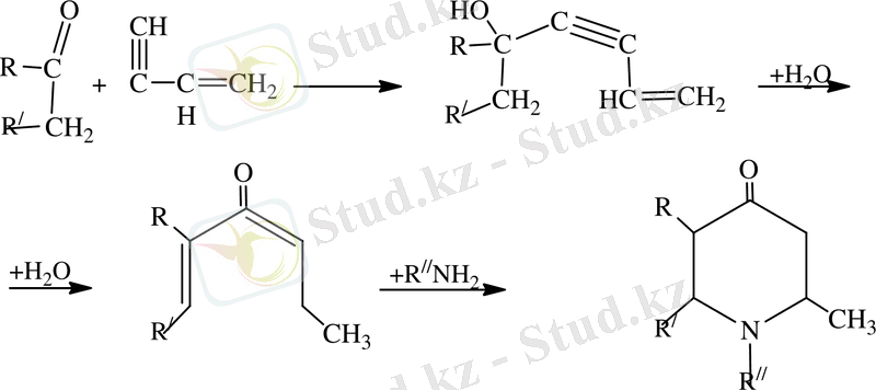 Гамма-пиперидондар химиясының дамуына үлкен еңбек сіңірген И. Н. Назаров және оның қызметкерлері еңбегі мол болған. Вининилацетиленің кетонмен конденсациясы және дегидратциялануы мұнда винилацетил спирттері дивинилацетиленнің көмірсутектеріне дейін түзіледі, одан кейінгі түзілген дивинилкетондардың гидратациясы жай және қол жетімді әдістермен синтез жолы пайдаланылған.